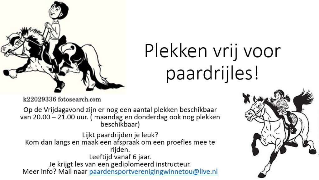 Kijk onder één van de kopjes, daar vind je alle informatie met betrekking tot de lessen, van lesrooster tot vrij rijden en hoe je lid wordt.